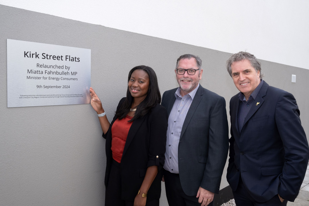 Torus Group was delighted to welcome Miatta Fahnbulleh MP, Minister for Energy Consumers and (Liverpool City Region) Metro Mayor Steve Rotheram and representatives from the Department for Energy Security and Net Zero and Liverpool City Region Combined recently to the Kirk Street flats in Everton to celebrate the completion of a significant £1.6 million investment retrofit and refurbishment project.
